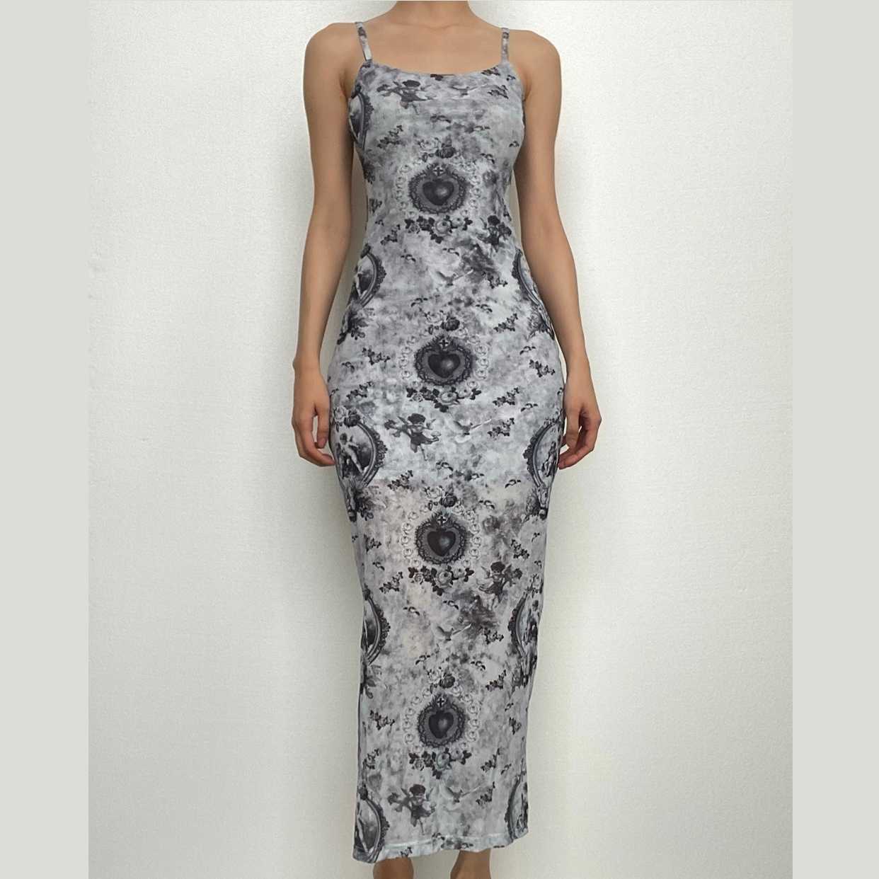 Slit contrast print sheer mesh see through u neck cami midi dress