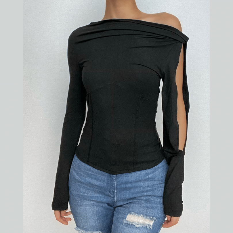 Solid long sleeve off shoulder irregular knotted hollow out cut out top