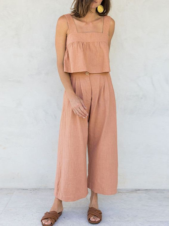 Square Neck Sleeveless Button Crop Tank Top and Elastic Wide Leg Pants Set?