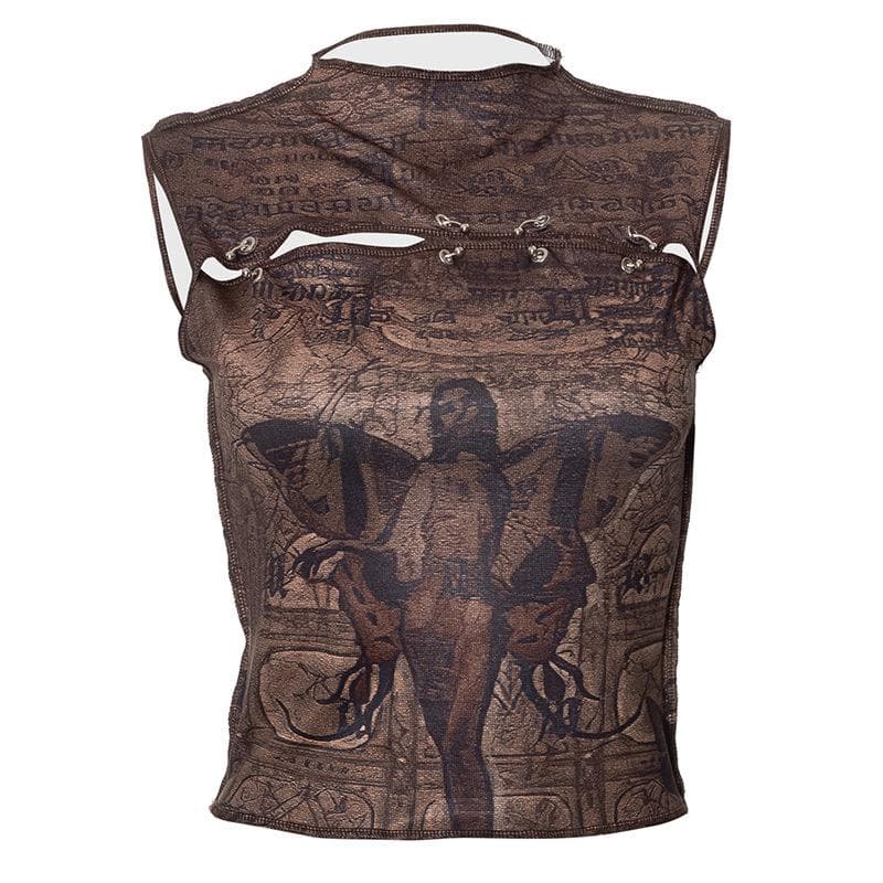 Stitch abstract print sleeveless hollow out o ring crop cut out top