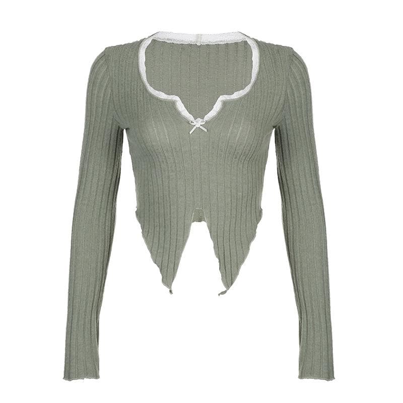 Textured lace hem contrast long sleeve notch neck slit crop top