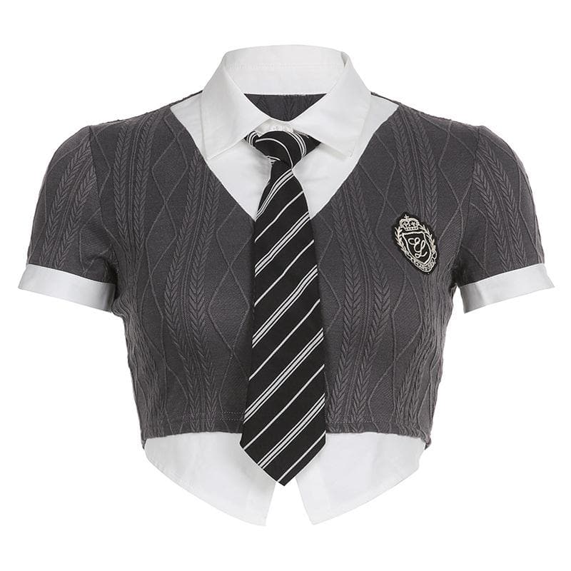 Textured short sleeve patchwork necktie turnover collar crop top