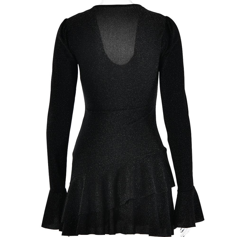 Textured v neck ruffle irregular long flared sleeve mini dress
