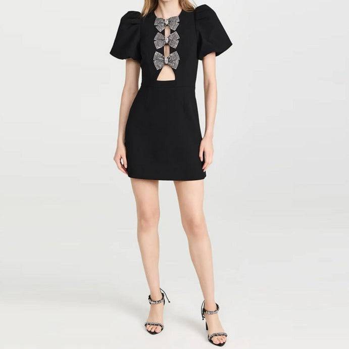 - Vicky embodies a sense of feminine elegance with its puff sleeves. bow tie embellishment. and mini length.