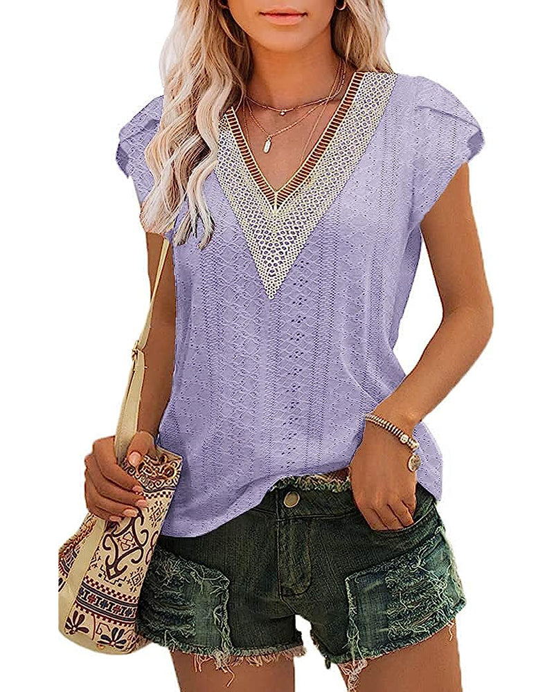 Soft Material The V Neck Shirt is made with 65% Rayon. 30% Polyester. 5% Spandex that feels as light as a feather. Eyelet design feels breathable. This premium-weight petal short-sleeve top provides a beautiful drape and luster for daily wear.