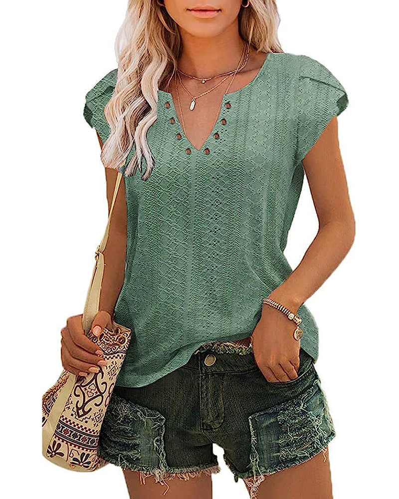 Soft Material The V Neck Shirt is made with 65% Rayon. 30% Polyester. 5% Spandex that feels as light as a feather. Eyelet design feels breathable. This premium-weight petal short-sleeve top provides a beautiful drape and luster for daily wear.
